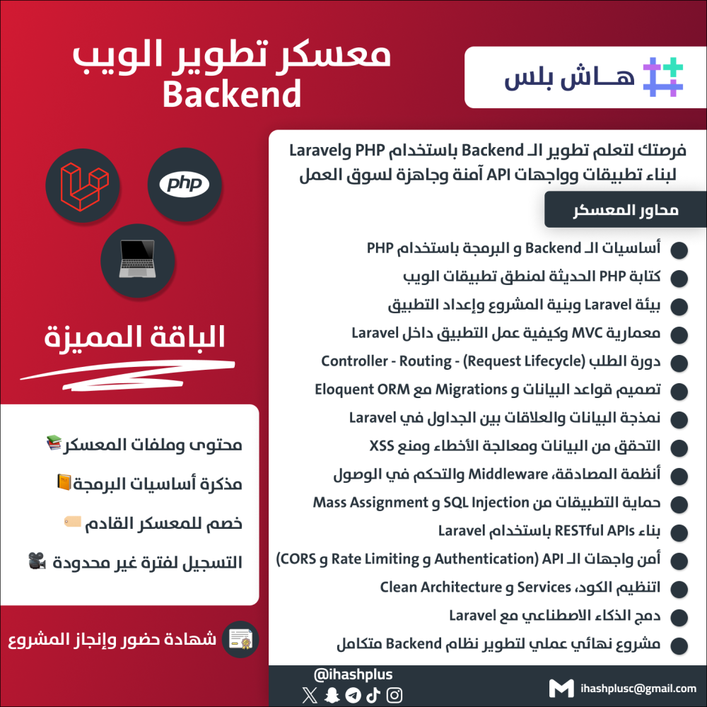 فرصتك لتعلّم تطوير الويب من جهة الخادم (Backend) باستخدام PHP وLaravel، عبر بناء تطبيقات حقيقية، تصميم قواعد بيانات، تطوير RESTful APIs آمنة، ودمج الذكاء الاصطناعي لبناء حلول احترافية جاهزة لسوق العمل.